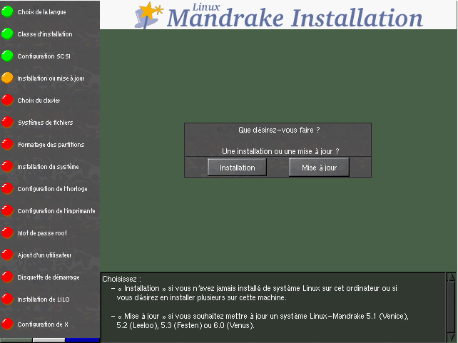 Le texte d'aide parle pour lui-même: vous devrez choisir Installation si vous installez Linux pour la première fois sur votre machine (ou tout simplement si vous voulez réinstaller par-dessus une installation existante), et Mise à jour si une version antérieure de Linux-Mandrake est déjà installée sur votre machine (figure 7.4).