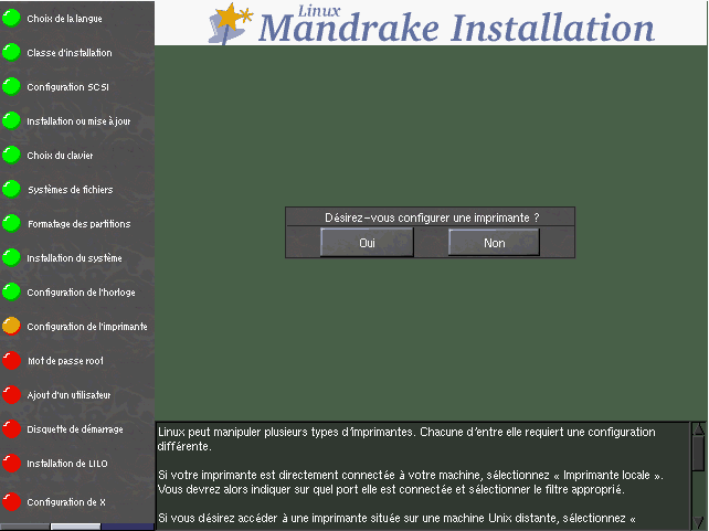 L'impression sous Linux requiert plusieurs choses: la première est que vous configuriez le mode d'accès à cette imprimante (locale, distante) pour pouvoir y accéder, la deuxième chose est de configurer le filtre d'impression: celui-ci varie en fonction du modèle de votre imprimante. Pour configurer un imprimante, il vous faudra évidemment répondre Oui à la question de la figure 7.8.