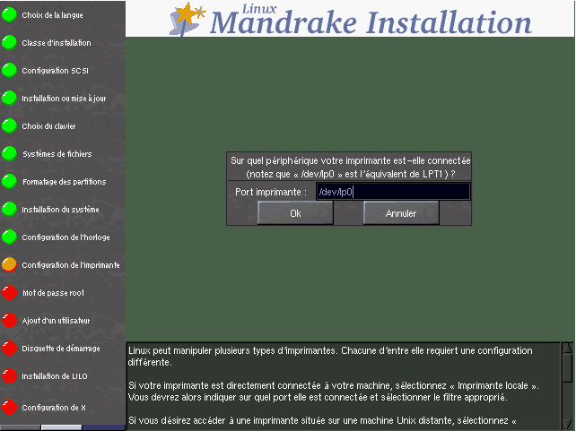 Si vous avez une imprimante locale, DrakX essaiera d'en détecter la marque et le modèle: les imprimantes modernes supportent cette fonctionnalité. Au cas où il n'y arriverait pas, il vous demandera alors sur quel port est branchée votre imprimante. Dans le cas où vous n'avez qu'une seule imprimante, choisissez toujours /dev/lp0 (figure 7.10).